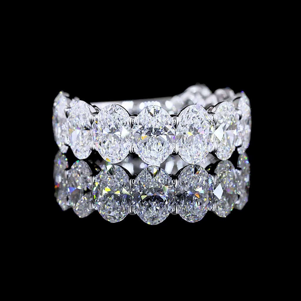 This platinum 3/4 eternity band features eleven oval-shaped diamonds, each positioned in a north-south prong setting to emphasize their captivating E VS color and clarity. With an average center weight of 0.52 carats, these diamonds create a harmonious display of light, offering a balanced and comfortable fit. The thoughtful design ensures that each facet brilliantly interacts with the light, enhancing the natural allure of the band.