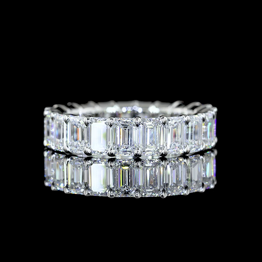 This platinum eternity band features 21 emerald-cut diamonds, totaling 4.73 carats, each set in a north-south prong setting that enhances their hallmark "hall-of-mirrors" effect. The diamonds, graded E VS, are meticulously aligned to create a seamless circle of light, each with an average weight of 0.23 carats, offering a sophisticated play of light and shadow. The sleek platinum profile ensures both durability and comfort, making it an ideal choice for those who appreciate refined craftsmanship.